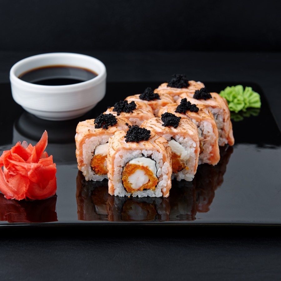 Рис, сыр филадельфия, лосось, креветка темпура, икра тобико.
